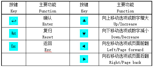 按鍵包括上、下、左、右、確認鍵、返回鍵及復歸鍵,實現人機交互功能。