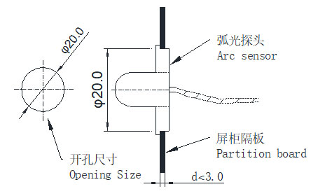 弧光傳感器配套卡扣支架使用,卡扣支架需要開孔安裝。卡扣支架的開孔尺寸為20mm(直徑)。