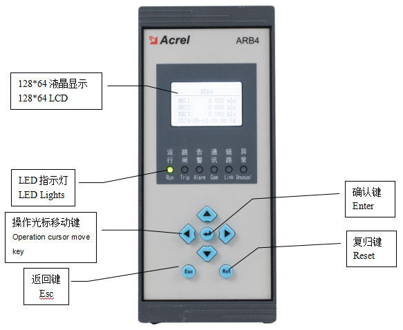 液晶顯示屏采用128*64點陣,可以顯示弧光強度、電流、電壓等遙測量值、遙信量、事件記錄、通信參數、定值參數、裝置時間、裝置版本號信息等。