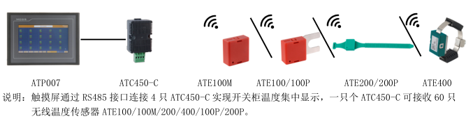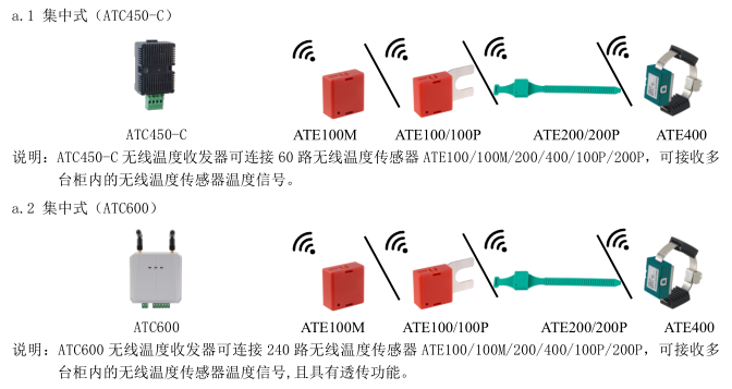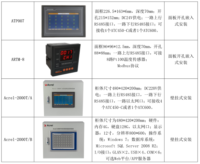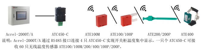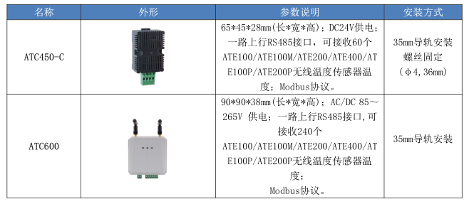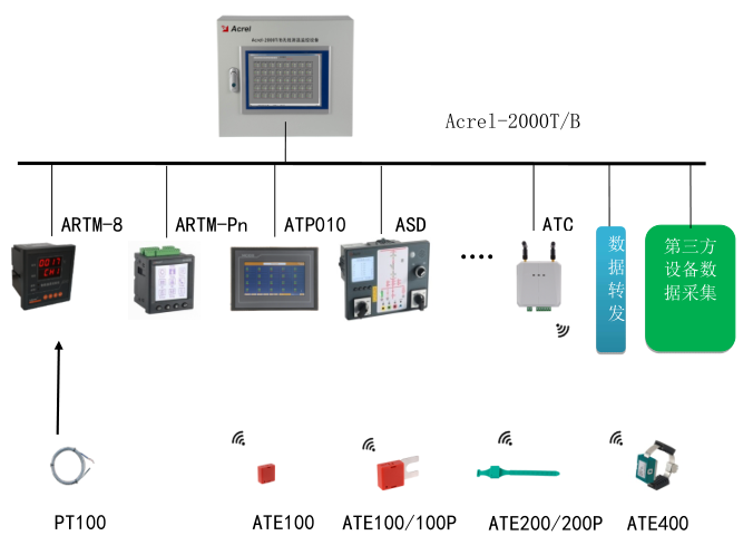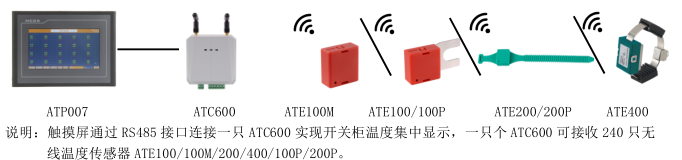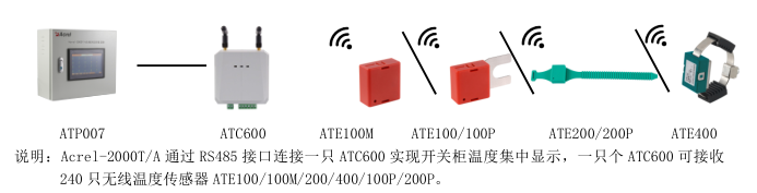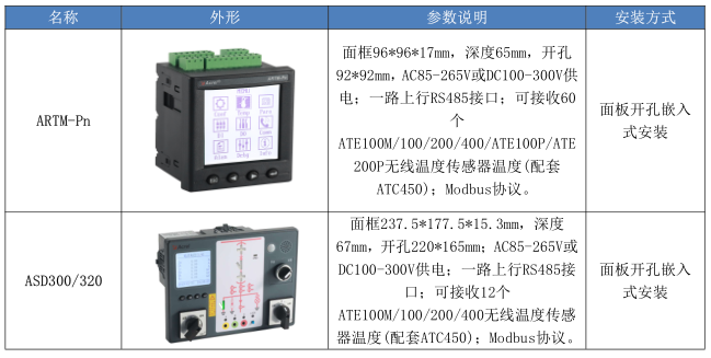ARTM-Pn無線測溫裝置:ARTM-Pn無線測溫裝置可以單獨安裝在高壓柜、低壓抽屜柜內,每臺裝置可以接收18個傳感器的數據,傳感器型號可選配ATE100、ATE200、ATE300。裝置帶有一路485接口,可將采集到的溫度數據上傳到監控中心。