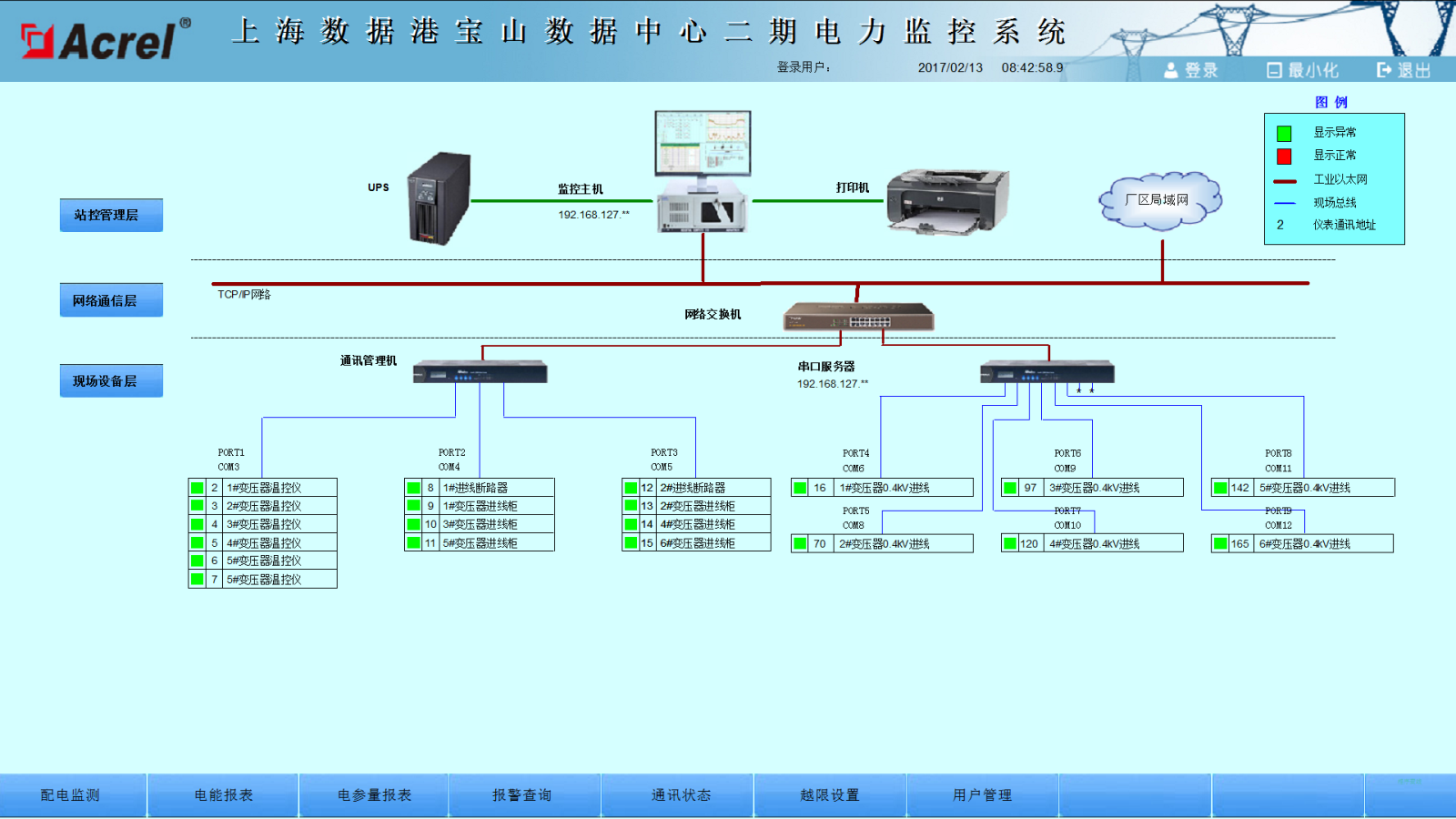 上位機軟件采用ACREL-2000電力監控系統,通過軟件進行設備配置、數據庫變量配置、界面設計等,完成了在上位機軟件監控及電力監控的功能。