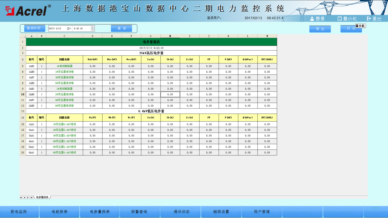 參數報表反映了本項目監測回路的在過去某時間點的運行數據,通過當前或者過去某時間點的實時參量數據反映回路狀態。主要的數據包括:三相電壓,三相電流,電能,有功功率,無功功率,功率補償因數,頻率。界面如圖4所示
