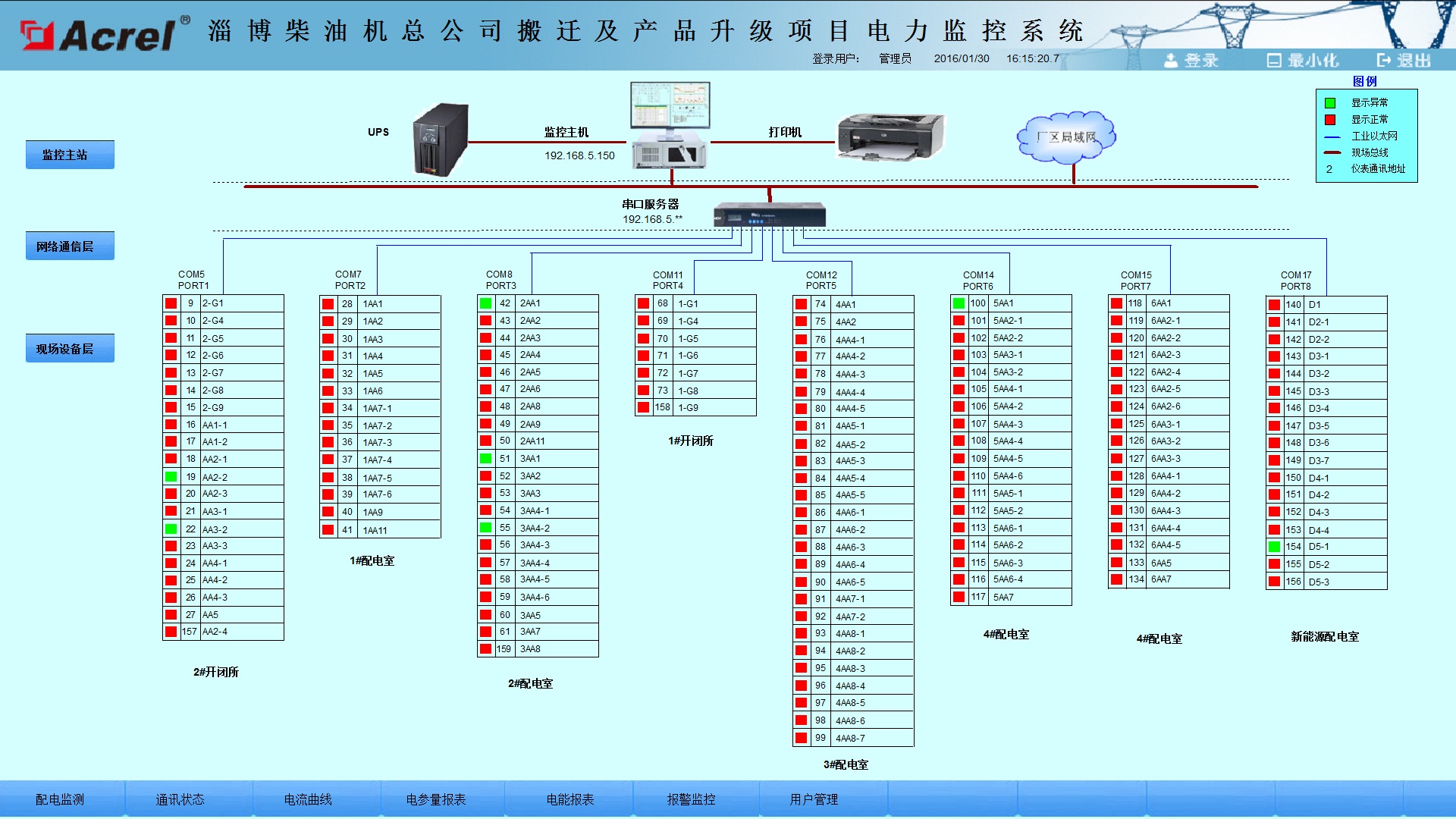 本項目共139只A CR220EFL多功能儀表。1#開閉所、2#開閉所、1#配電室、4#配電室配電室內(nèi)分別放置采集裝置。現(xiàn)場儀表經(jīng)485總線連接至對應(yīng)的采集裝置,現(xiàn)場串口服務(wù)器經(jīng)網(wǎng)線或光線將數(shù)據(jù)傳輸至監(jiān)控主機上。
