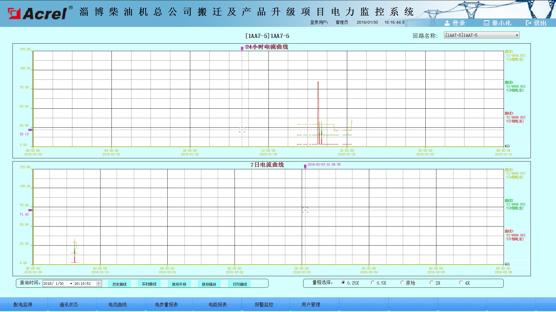 負荷趨勢曲線功能主要負責定時采集進線及重要回路電流和功率負荷參量,自動生成運行負荷趨勢曲線的,方便用戶及時了解設(shè)備的運行負荷狀況。點擊畫面相應(yīng)按鈕或菜單項可以完成相應(yīng)功能的切換;可以查看實時趨勢曲線或歷史趨勢線;對所選曲線可以進行平移、縮放、量程變換等操作,幫助用戶進線趨勢分析和故障追憶,為分析整個系統(tǒng)的運行狀況提供了直觀而方便的軟件支持。