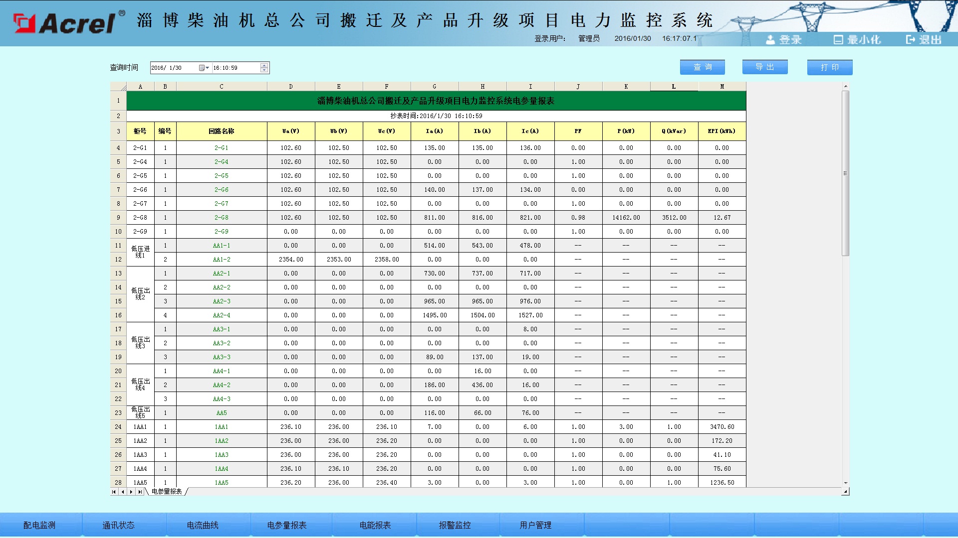 參數(shù)抄表功能,主要對低壓各出線回路的電參數(shù)進線查詢。支持任意時刻電參數(shù)查詢,具備數(shù)據(jù)導出和報表打印等功能。該報表查詢供兩個變電所4臺變壓器出線各低壓回路的電參數(shù),主要包括:三相電流、有功功率和有功電度及變壓器溫度。該報表各回路名稱和數(shù)據(jù)庫關(guān)聯(lián),方便用戶修改回路名稱。見圖(2)。