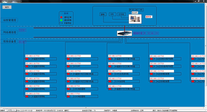 10)網絡拓撲圖:支持實時監視接入系統的各設備的通訊狀態,能夠完整的顯示整個系統網絡結構;可在線診斷設備通訊狀態,發生網絡異常時能自動在界面上顯示故障設備或元件及其故障部位。
