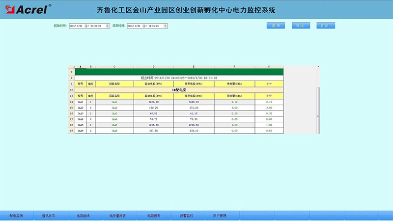 用電量報表功能,可選擇時間段進行查詢,支持任意時間段電度累計查詢,具備數據導出和報表打印等功能。為值班人員提供了可靠的電能報表。該報表各回路名稱和數據庫關聯,方便用戶修改回路名稱。如下圖所示,顯示配電室某段時間內的各配電回路的用電量,用戶可以直接打印報表,可以以EXCEL格式另存到其他位置。 見圖(3)。