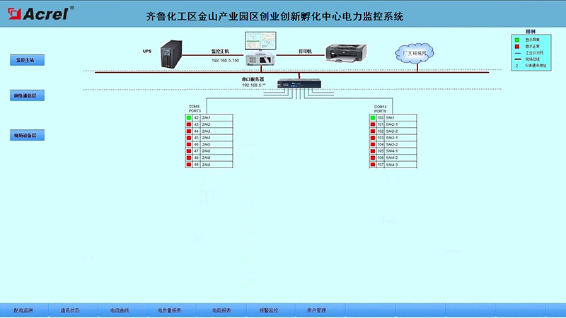 本項目共5臺AM5系列微機保護裝置、45臺ACR系列多功能電力儀表。在配電室內放置采集裝置,現場多功能儀表經485總線連接至對應的采集裝置,現場串口服務器經網線將數據傳輸至監控主機上。