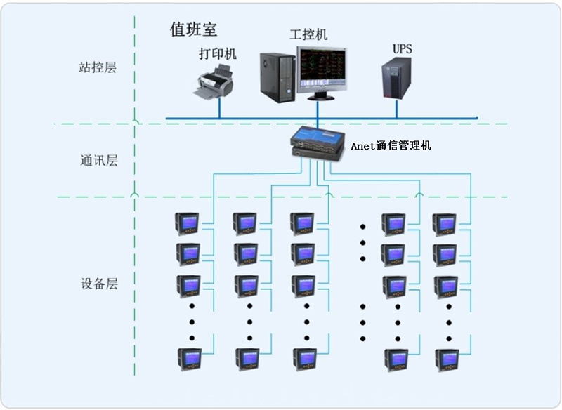 網絡通訊層主要為:Anet智能網關將配電柜內的綜保和電力儀表集中采集,同時遠傳至站控層,完成現場層和站控層之間的數據交互。
