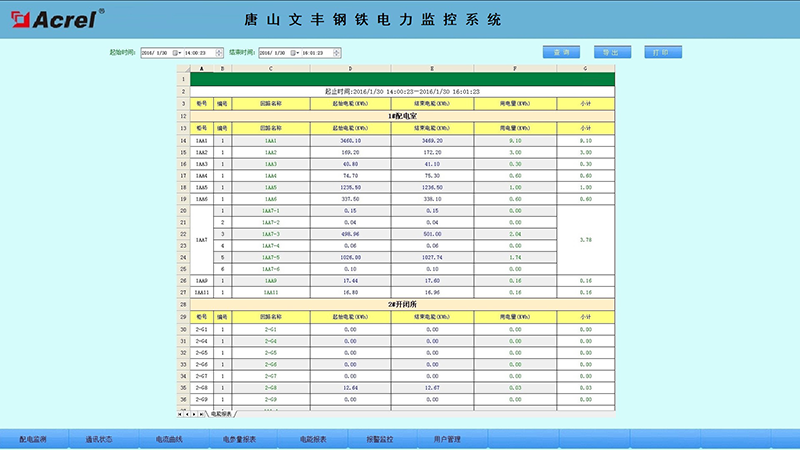 報表具有自由設置查詢時間實現日、月、年的電能統計,數據導出和報表打印等功能。