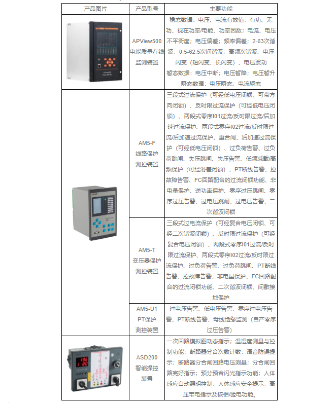 因此,為了實時監測供電的電能質量,在本項目的高壓配電進線柜處裝設一臺電能質量監測裝置APView500,同時為了保證整個配電系統日常安全穩定運行,在每面高壓開關柜裝設一臺AM5系列微機保護裝置和一臺ASD200智能操控裝置;為了監測各回路的電能,在每面高壓開關柜和低壓柜均配置我司的多功能儀表。各類設備主要實現的功能如下:
