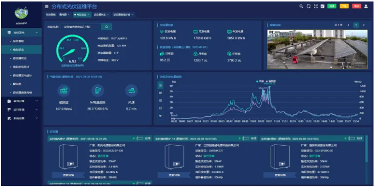 3)光伏監(jiān)測(cè):以配電圖的形式直觀顯示光伏電站的運(yùn)行狀態(tài), 實(shí)時(shí)監(jiān)測(cè)各逆變器的電壓、電流、輸出功率等電參量。展示當(dāng)前光伏電站發(fā)電功率,補(bǔ)貼電價(jià),峰值功率等基本參數(shù)。統(tǒng)計(jì)當(dāng)前光伏電站的日、月、年發(fā)電量及發(fā)電收益。