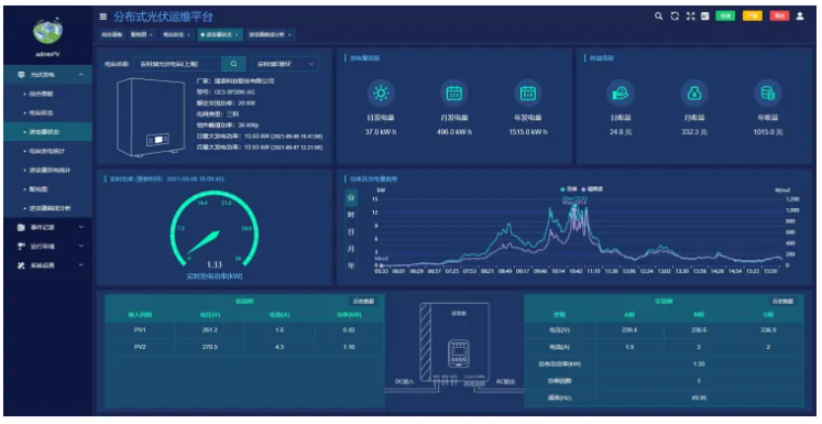 逆變器狀態(tài):日、月、年發(fā)電量及發(fā)電收益顯示。顯示逆變器功率、環(huán)境輻照度曲線。直流側(cè)電壓電流查詢。逆變器曲線分析:展示交、直流側(cè)電壓、功率、輻照度、溫度曲線。