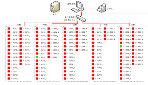 系統(tǒng)通訊結(jié)構(gòu)示意圖,主要顯示系統(tǒng)的組網(wǎng)結(jié)構(gòu),系統(tǒng)采用分層分布式結(jié)構(gòu),同時監(jiān)測間隔層設(shè)備的通信狀態(tài)。紅色表示通訊正常,綠色表示通訊故障。見圖(8)。
