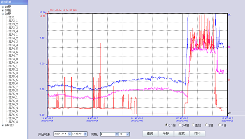 負(fù)荷趨勢曲線界面中可直觀的查看回路的負(fù)荷運(yùn)行情況。查看實(shí)時和歷史趨勢曲線,點(diǎn)擊畫面相應(yīng)按鈕或菜單項可以完成相應(yīng)功能的切換;幫助用戶進(jìn)線趨勢分析和故障追憶,具備曲線打印功能。為分析整個系統(tǒng)的運(yùn)行狀況提供了直觀而方便的軟件支持。見圖(5)。