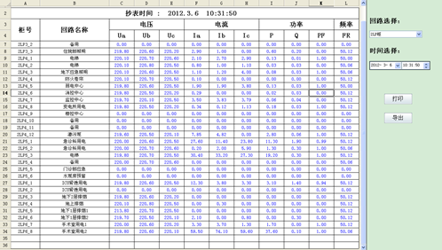 系統(tǒng)對所有采集到的數(shù)據(jù)都能實(shí)時的顯示,并保存到數(shù)據(jù)庫中,因此可以手動查詢每個回路的所有實(shí)時及歷史電參量數(shù)據(jù),并以表格的形式展現(xiàn)給用戶,便于打印、保存。如圖3所示。