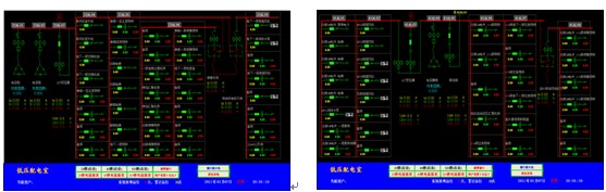 系統提供簡單、易用、良好的用戶使用界面。采用全中文界面,CAD圖形顯示配電系統電氣一次主接線圖,顯示配電系統設備狀態及相應實時運行參數,畫面定時輪巡切換;畫面實時動態刷新;模擬量顯示;開關量顯示;連續記錄顯示等,通過畫面顏色的變化(紅色表示合閘狀態、綠色表示分閘狀態)可以看到各回路的分合閘狀態。