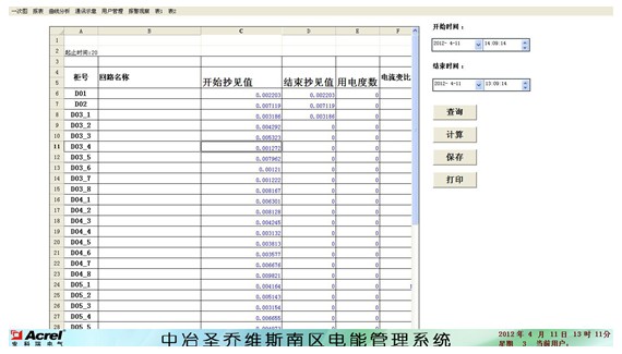 5.2. 遠程抄表查詢:各個配電室各個回路按照時間段進行歷史數據查詢。選擇回路后,可選擇時間間隔、時間長度對該回路進行歷史數據查詢,包括電壓、電流、功率、功率因數和電能等常用數據。查詢結果可導出成EXCEL表格進行保存,也可打印保存