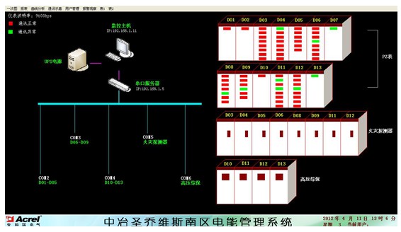 對圣喬維斯管理方提出的需求和我們確定的組網方案,站控管理層設備層采購華北工控的工業主機,三星19寸顯示器,SANTAK的UPS;網絡通訊層使用MOXA的NPORT5630-8串口服務器;現場設備層采上海安科瑞公司PZ96-E4系列網絡電力儀表、小武松漏電監測儀、南瑞綜保,總線鋪設屏蔽雙絞線,以滿足系統組網的要求。
