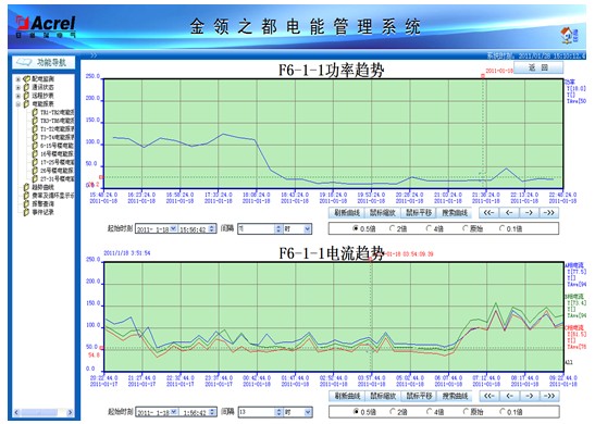 5.3趨勢曲線:功率實時趨勢顯示及歷史趨勢查詢功能。選擇回路后,該回路實時趨勢曲線會不斷刷新,選擇“起始時間”可查看該回路歷史趨勢曲線,選擇“時間長度”可查看歷史日、月、年趨勢曲線,能更加直觀反映該回路運行情況。