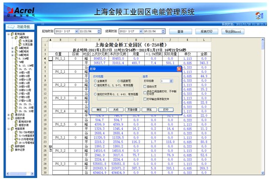 5.2. 遠程抄表查詢:各個配電室各個回路按照時間段進行歷史數據查詢。選擇回路后,可選擇時間間隔、時間長度對該回路進行歷史數據查詢,包括電壓、電流、功率、功率因數和電能等常用數據。查詢結果可導出成EXCEL表格進行保存,也可打印保存