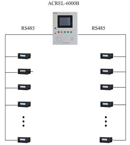 本工程共1棟建筑,共計27個配電箱,根據《建筑電氣火災預防要求和檢測方法》有關條文明確要求“為防止電氣設備和線路漏電火災,應在電源進線端設置自動切斷電源或報警的剩余電流動作保護器”。 因此本項目在各配電箱進線處設置漏電火災探測器3臺ARCM200BL-J1、24臺ARCM300-J1以及27臺剩余電流互感器AKH-0.66L,并在消控室設立壁掛式電氣火災監控系統Acrel-6000/B。配電箱模塊通過一根485總線連接到后臺,將各處的漏電及溫度信息進行集中監控,便于工作人員進行統一管理。