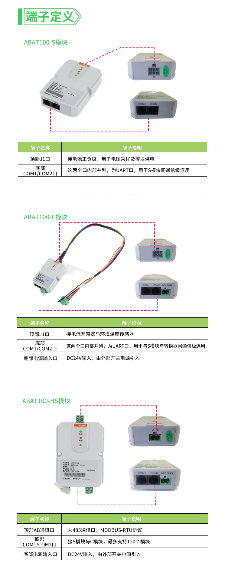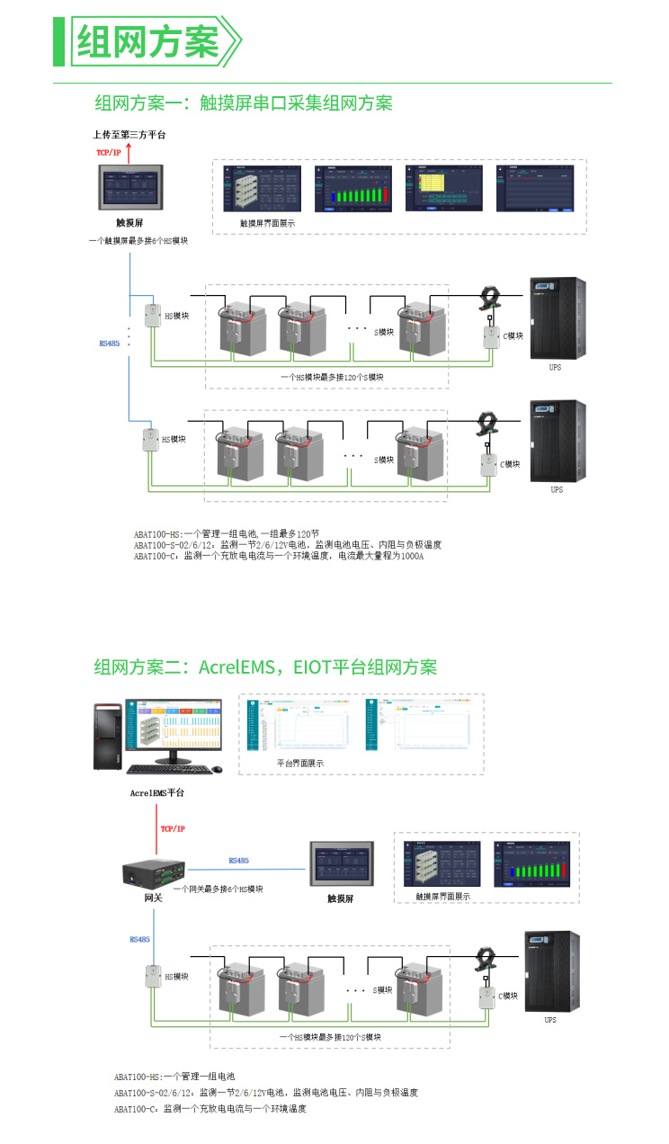 安科瑞公司ABAT系列蓄電池在線監(jiān)測系統(tǒng)是業(yè)界靠前的在線電池監(jiān)測產(chǎn)品,可以提前對失效的電池進(jìn)行預(yù)警及電池均衡,符合ANSI/TIA-942標(biāo)準(zhǔn)要求。該系統(tǒng)具有監(jiān)測電池的電壓、內(nèi)阻與內(nèi)部溫度功能,安裝、維護(hù)與接入非常方便,其主要性能遠(yuǎn)遠(yuǎn)高于同類廠家,目前處行業(yè)靠前地位。系統(tǒng)主要由ABAT-S模塊、ABAT-C模塊及采集器組成,可通過采集器查詢告警與實時數(shù)據(jù)、設(shè)置參數(shù)等,可選配監(jiān)測平臺實現(xiàn)網(wǎng)絡(luò)化集中管理。