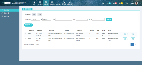 隱患管理包括隱患巡查、隱患處理、和隱患記錄,隱患巡查的目的是為了隱患產生之后下發工單,所以頁面中只顯示未下發工單的隱患記錄,包括隱患類型、創建時間、項目名稱、設備ID、位置、故障原因等記錄,并且可以通過“派發”按鈕,派發工作任務;隱患處理即工單處理,表示工單需要當前登錄用戶確認,形成隱患處理的閉環,頁面中只顯示發給當前登錄用戶且未處理的工單記錄;隱患記錄顯示所有的隱患記錄,可以按照隱患類型(報警、故障)、狀態(未派發、已派發未處理、已派發已處理)分類顯示,支持按照創建時間、項目名稱、所在區域等條件來對隱患記錄信息進行針對性的查詢操作。
