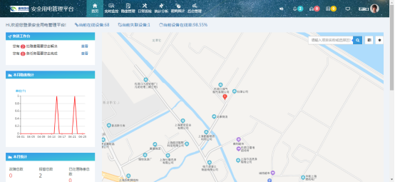 5.2 平臺首頁 通過平臺首頁可以快速瀏覽隱患巡查界面或隱患處理界面、本月隱患、故障統計以及項目信息地圖導航,智能調度技術人員可以及時通過曲線、地圖等各種方式查看隱患數量、隱患位置、隱患發生頻率以及任務的接收、下發情況,并可以通過項目列表、地圖快速查定位需要查詢的項目情況。