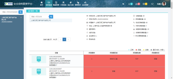 5.3 實時監控 通過實時監控界面,除了可以實時顯示項目所屬客戶、地址、建筑面積、消防設施、安全責任人、聯系電話、設備數量、探測器數量等信息,還以更醒目的方式顯示了未處理報警和未處理故障信息,下屬設備和探測器,并可以查看各設備以及探測器基本信息、開關操作、數據監控、實時數據、參數設置、歷史信息和報警信息等。
