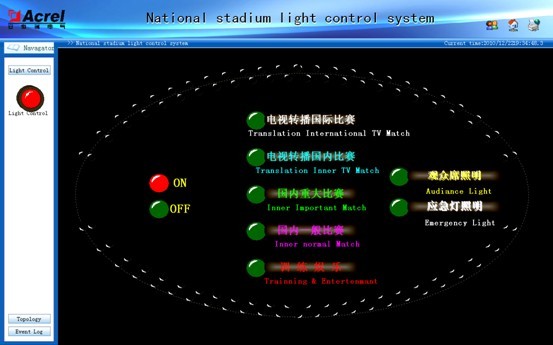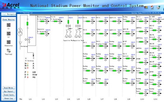 該項目共有一個配電室、一個發電機房共2個配電房和一個場地照明燈光控制室,提供體育場的辦公、照明、場館照明、空調用電及其它用電等。所有回路均裝有ACR320ELK網絡電力儀表,能測量到配電室的電壓、電流、功率等電參量,同時可以通過電操機構實現各回路的遠程分合閘。根據客戶要求,設計的Acrel-3000電力監控系統,不僅能實現對各配電回路的遠程監控和集中管理,而且還實現遠程分合閘操作;并能根據不同比賽規格實現場地照明的分級智能控制。